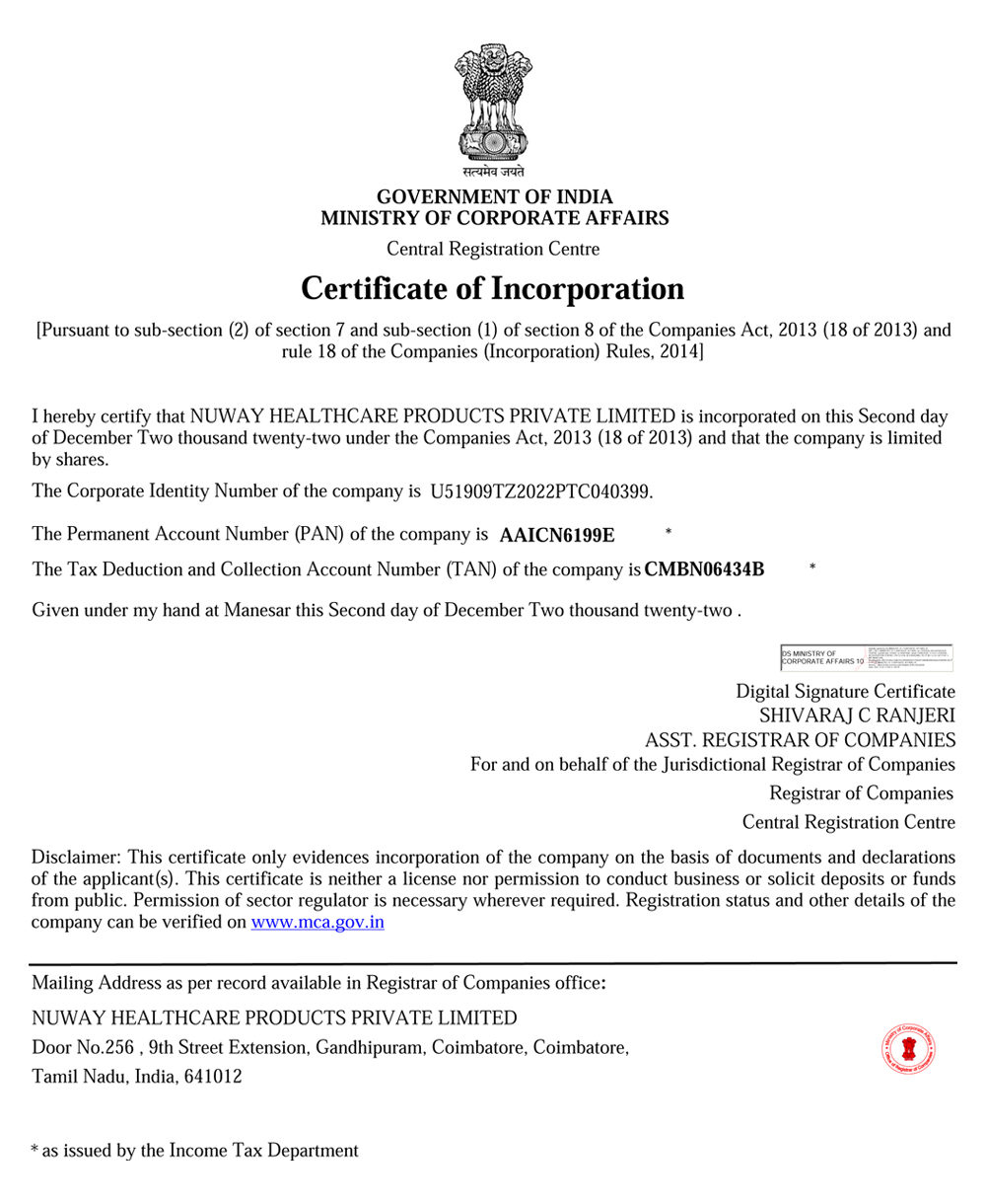 CERTIFICATE OF INCORPORATION - NUWAY HEALTHCARE PRODUCTS PRIVATE LIMITED |