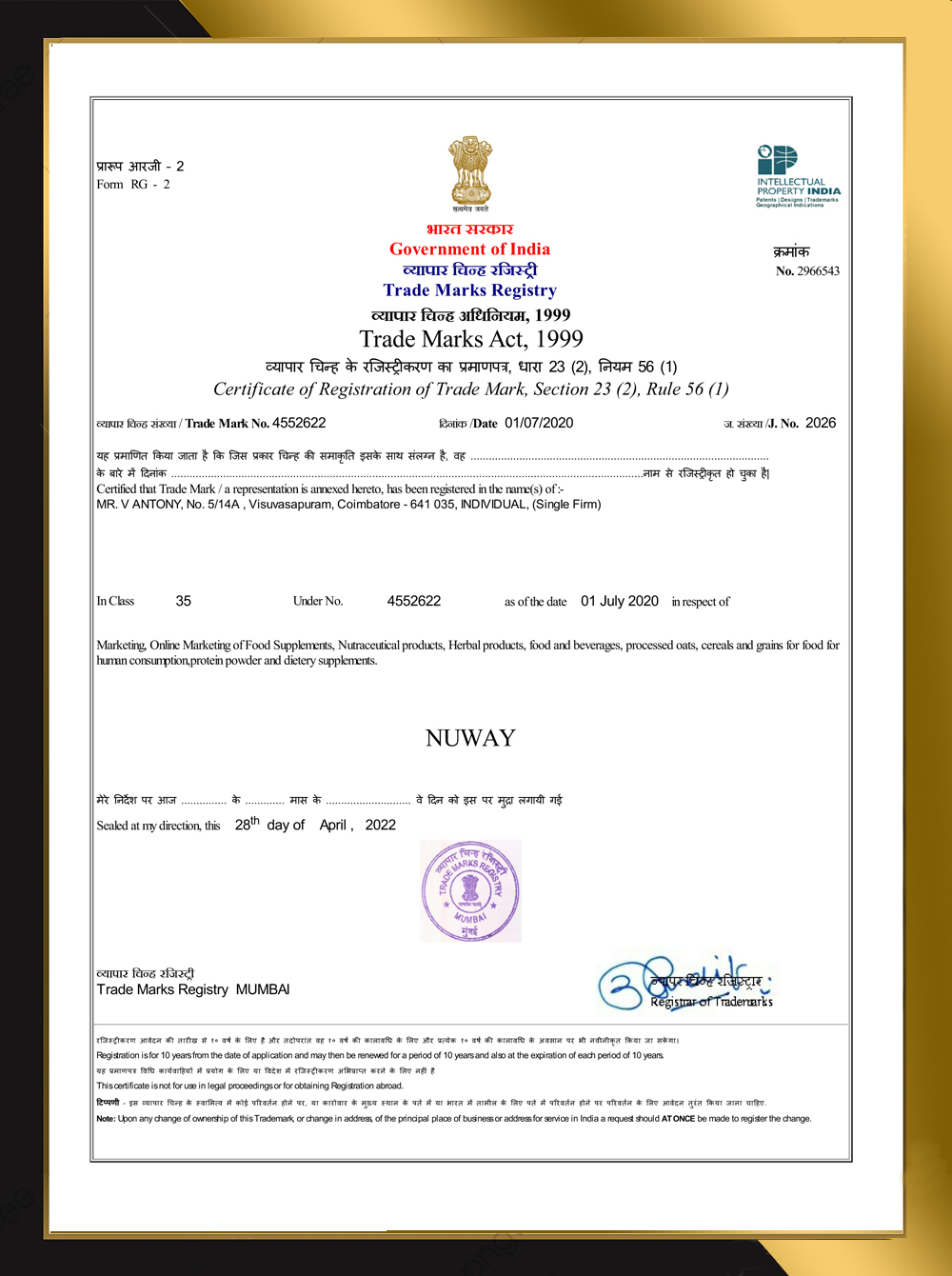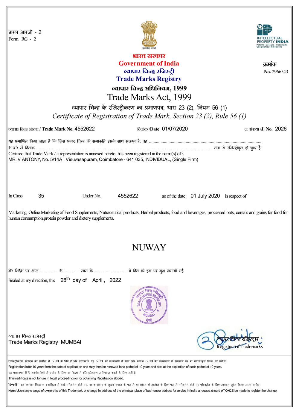 TM Registration Certification - NUWAY |