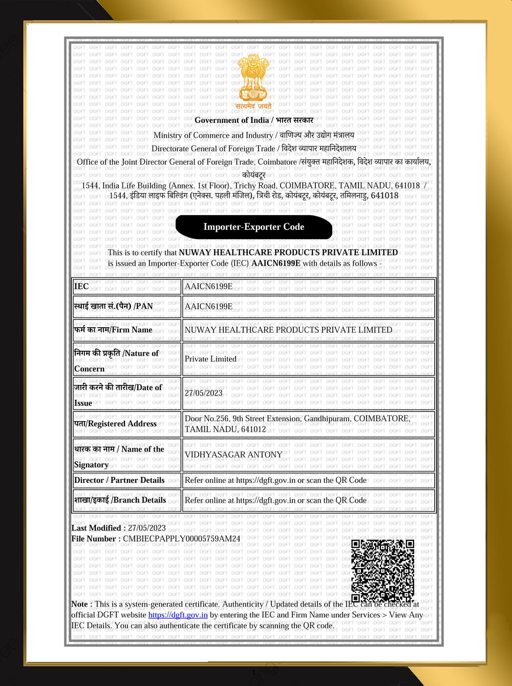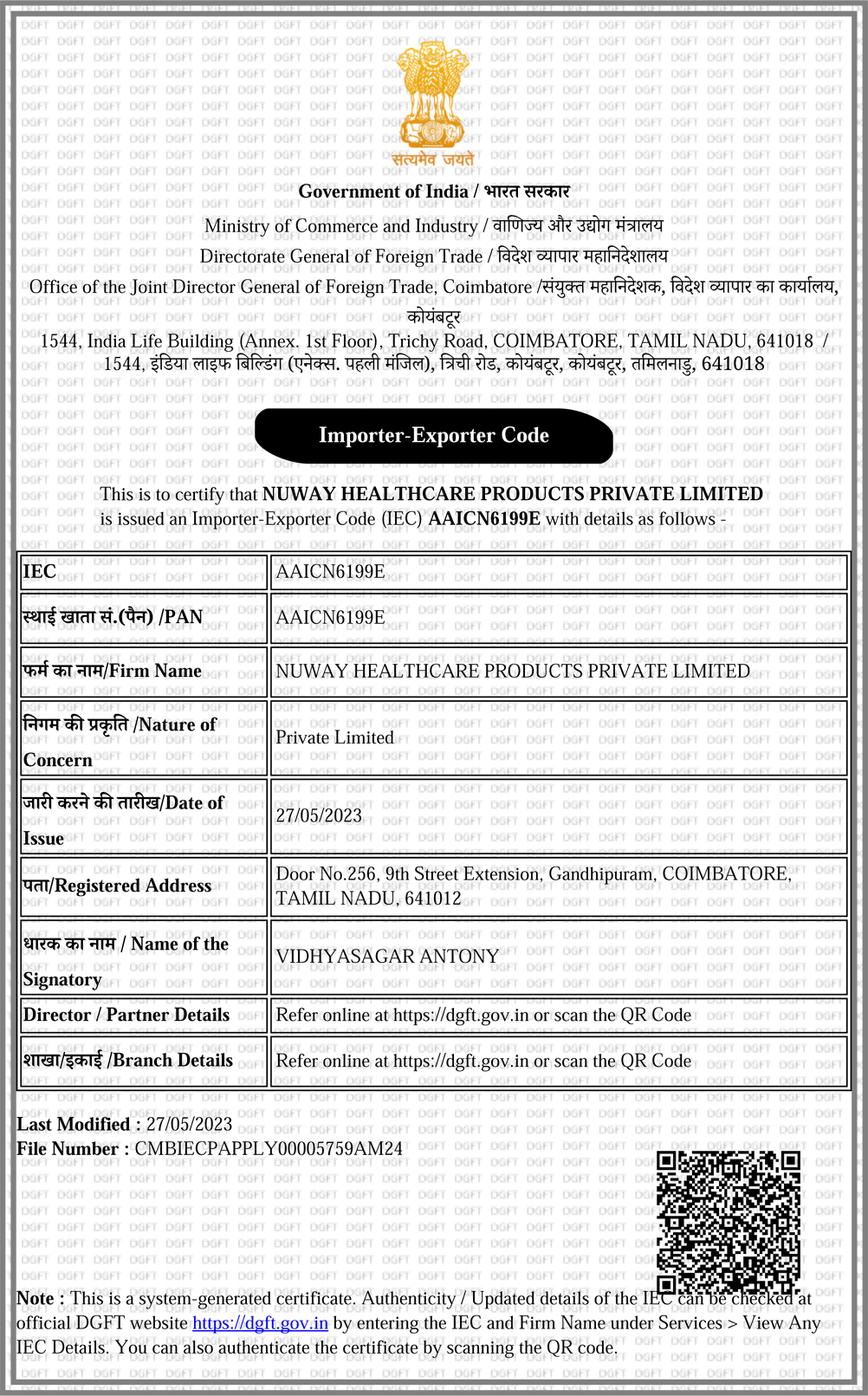 IE Code - NUWAY HEALTHCARE PRODUCTS PRIVATE LIMITED |