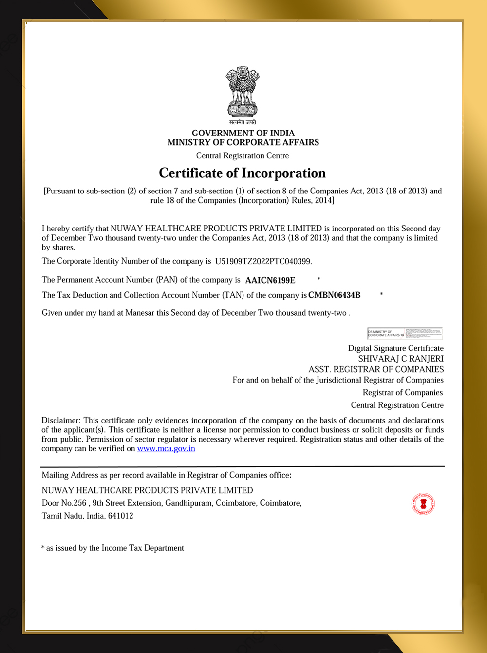 CERTIFICATE OF INCORPORATION - NUWAY HEALTHCARE PRODUCTS PRIVATE LIMITED |